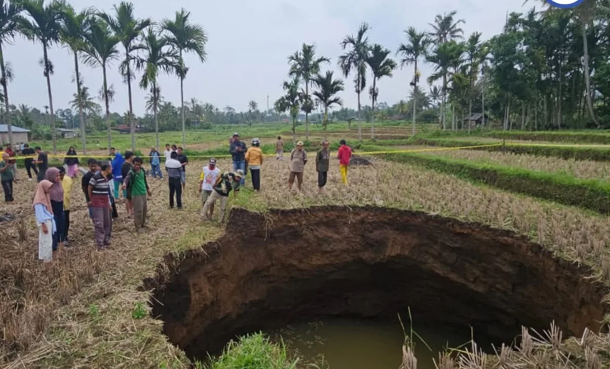 Limapuluh Kota – Warga Jorong Tepi, Kenagarian Situjuah Batua, Kecamatan Situjuah Limo Nagari, Kabupaten Limapuluh Kota, Sumatera Barat, dibuat gempar oleh kemunculan lubang raksasa atau sinkhole di area persawahan pada Minggu (4/1/2026).