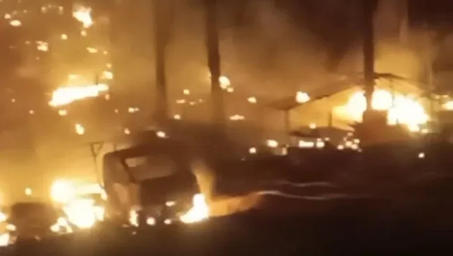 Api tampak meluas ke beberapa titik, memperlihatkan kondisi lokasi yang diduga merupakan area aktivitas pengeboran minyak ilegal (illegal drilling). Beberapa unit mobil yang berada di sekitar sumur terlihat hangus dilalap si jago merah, bahkan sebagian masih menyala saat video direkam.